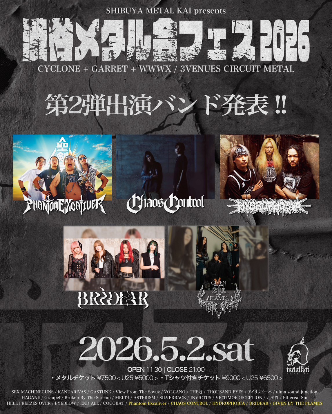 2026.5.2(土)渋谷メタル会フェス2026 出演バンド第二弾発表!!! Phantom Excaliver Chaos Control HYDROPHOBIA BRIDEAR GIVEN BY THE FLAMES 超絶ラインナップ、世代も性別も細かいジャンルをも超越した骨のあるメタルバンドが集結する強烈...
